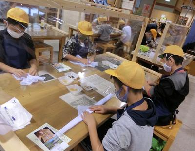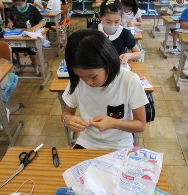 先生に教えてもらいながら練習用の布を使って作業している様子は、真剣そのものです。